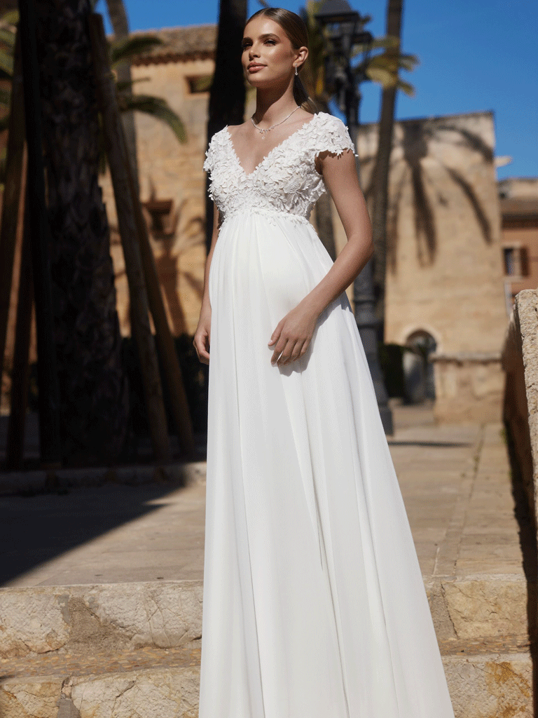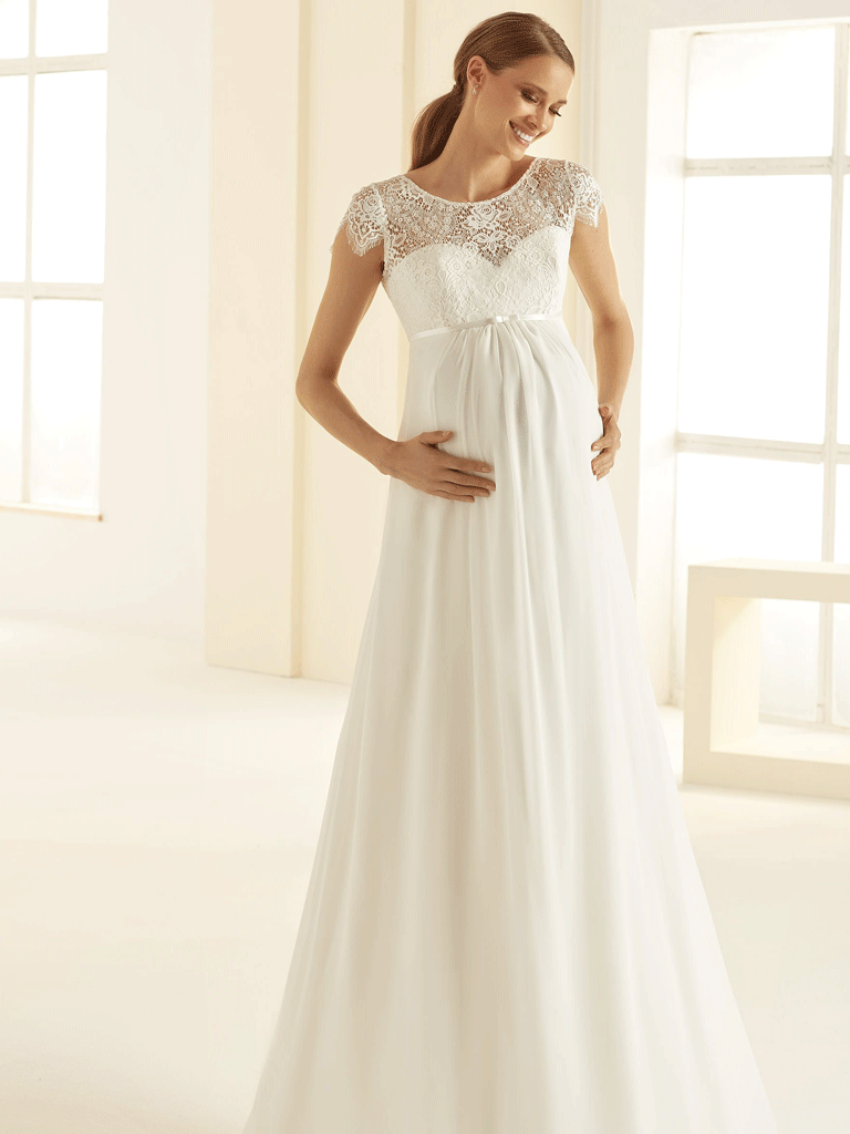 Das Wichtigste dabei: Du musst dir nach der letzten Anprobe keine Sorgen machen, ob der Bauch bis zur Hochzeit zu groß für das Kleid geworden ist. Das luftig fallende Rockteil lässt einfach genug Platz. Damit fällt auch eine große Sorge vor dem großen Tag einfach weg – und das ist für schwangere Bräute doch das Wichtigste – denn die Zeit ist aufregend genug.