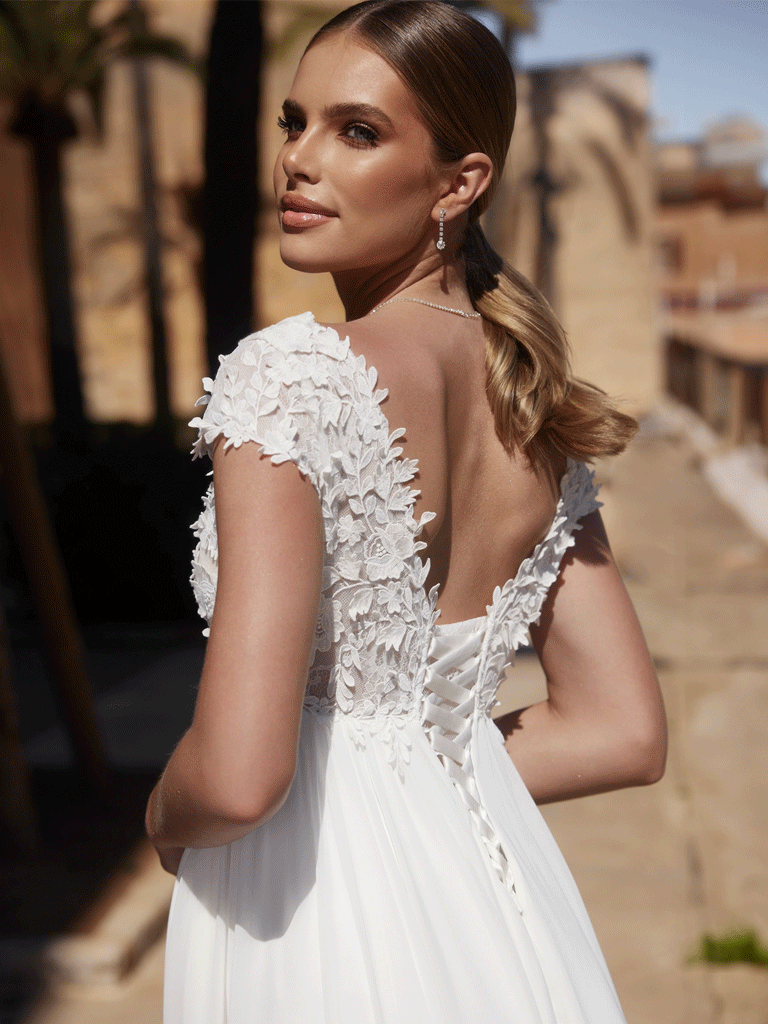Direkt unter der Brust, wo man oft eine Art Gürtelband trägt, fällt der Rock leicht und fließend herab. Der Schnitt ist zwar eher schlicht, aber durch besonders leichte, schön fallende Stoffe bekommst du als Braut einen richtig elfengleichen Look.